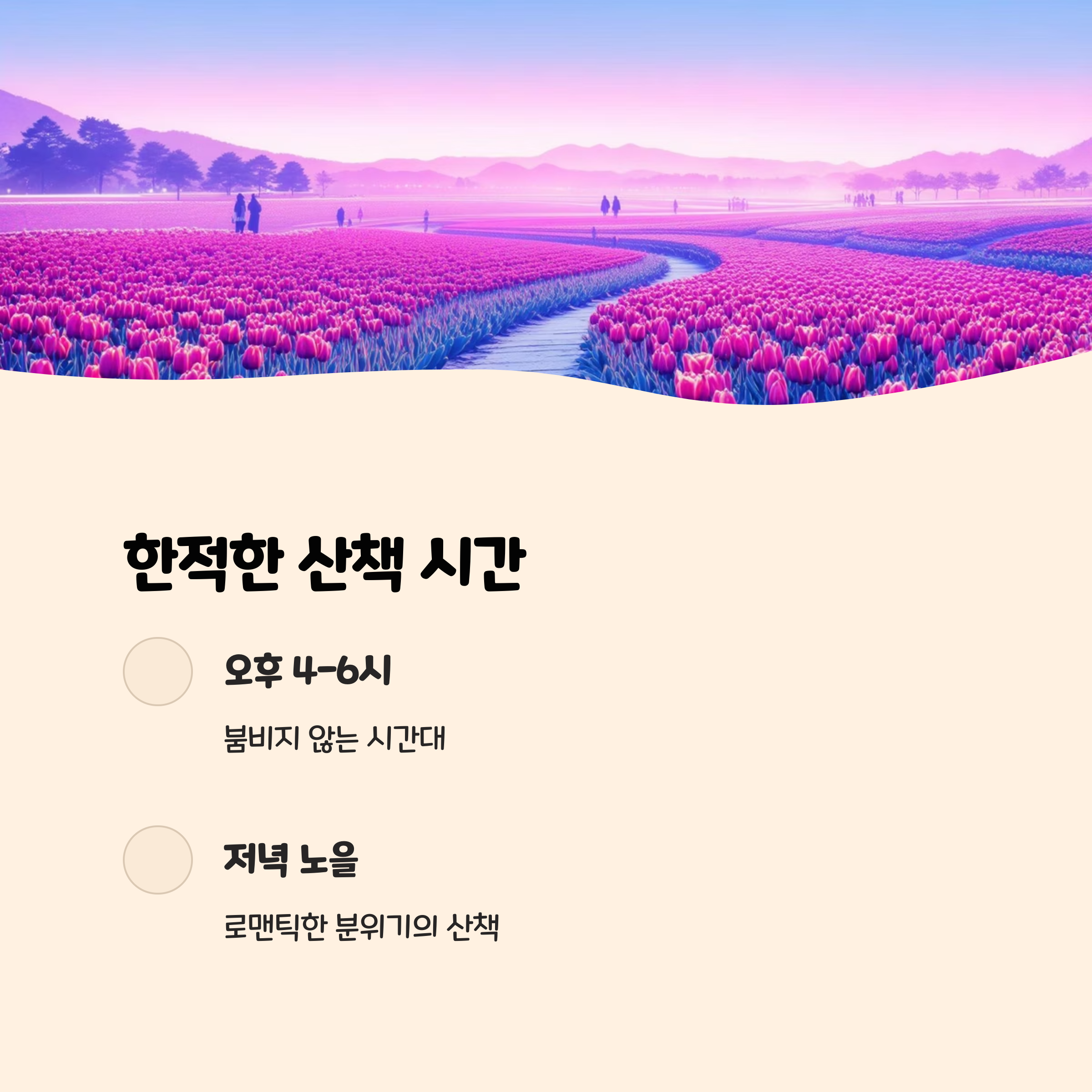 하이힐이나 불편한 샌들은 튤립밭 진입 시 불편할 수 있어요.