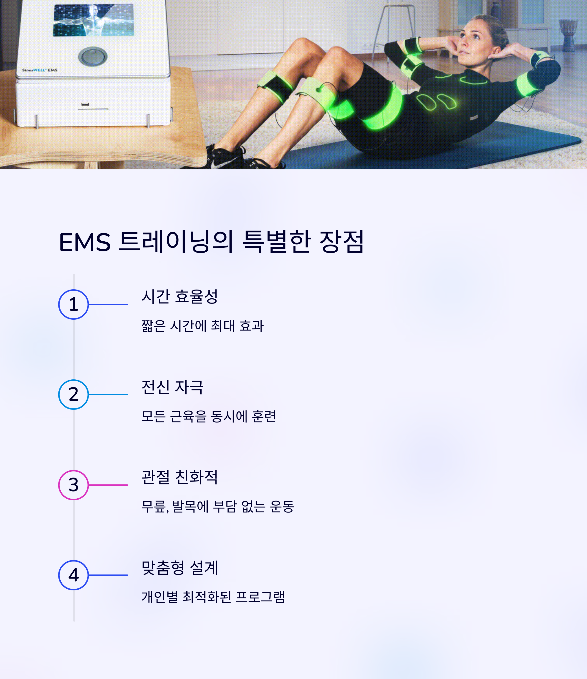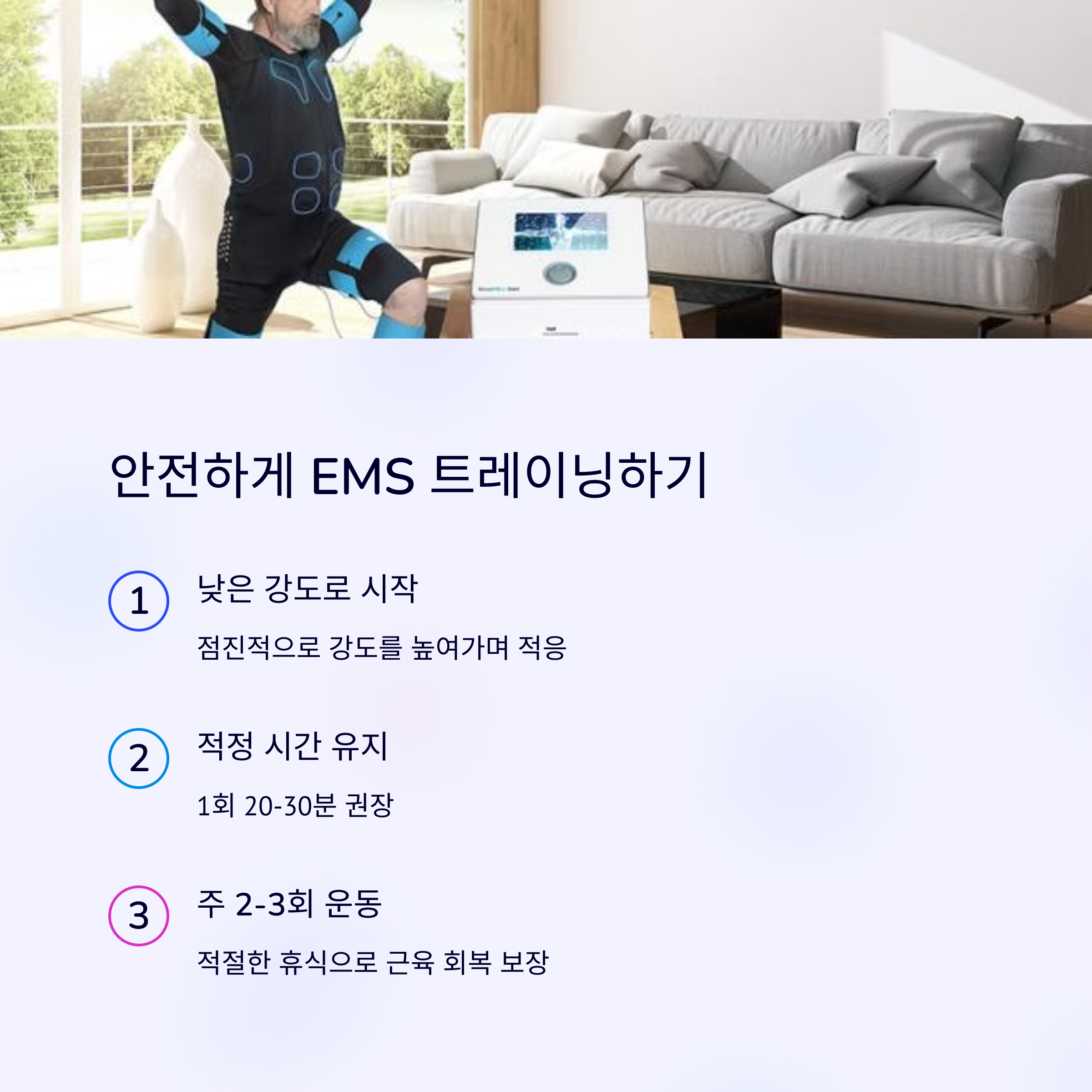 - 🔹 근육 회복 시간 확보 - 매일 EMS 트레이닝을 하는 것은 오히려 근육 피로를 유발할 수 있습니다.