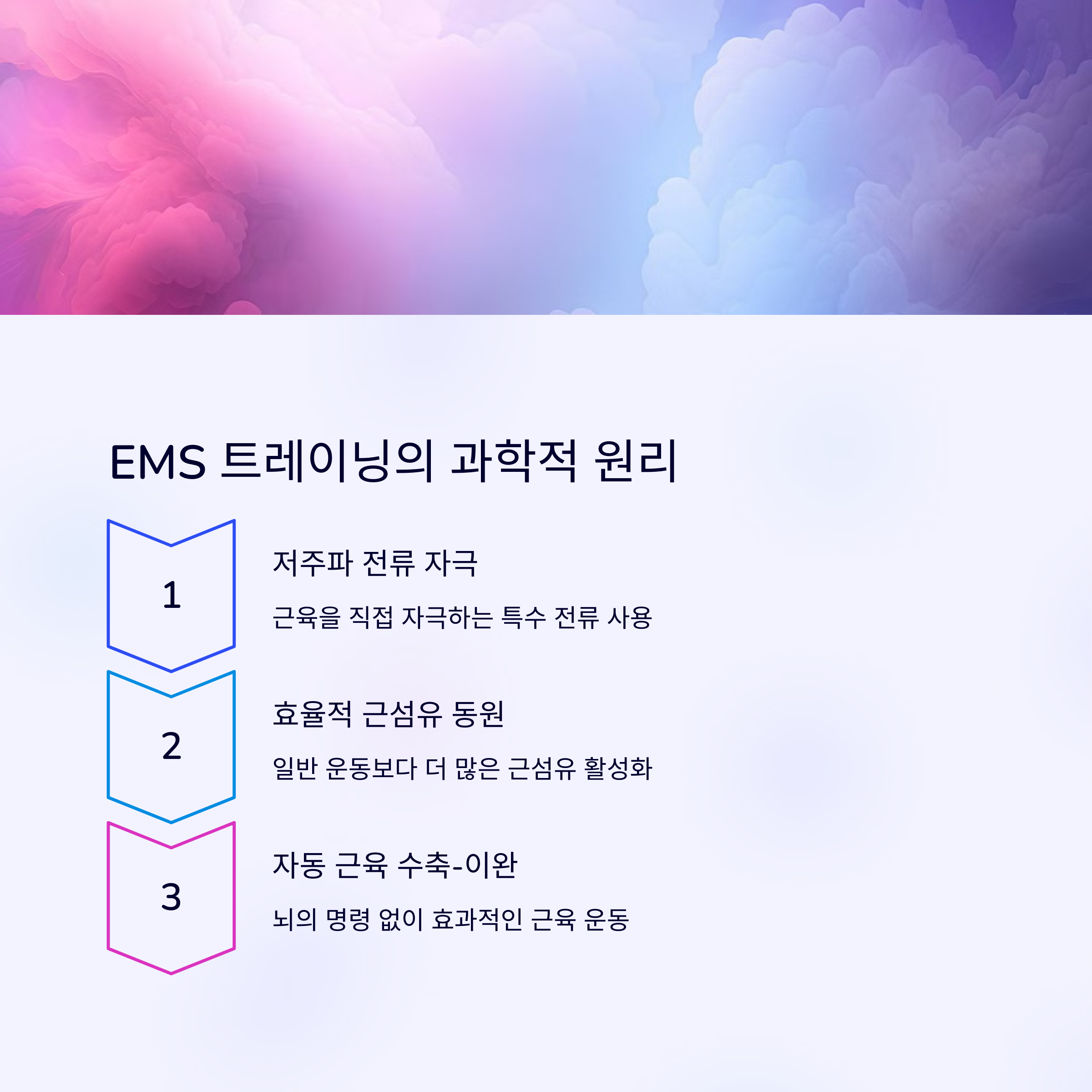 EMS(Electrical Muscle Stimulation) 트레이닝은 전기 자극을 통해 근육을 활성화시키는 운동 방식입니다. 우리 몸은 신경을 통해 전기 신호를 보내 근육을 수축시키지만, EMS 트레이닝은 전극을 이용해 이러한 자극을 외부에서 직접 전달하여 강력한 근육 수축을 유도합니다. 즉, 일반적인 운동보다 적은 노력으로도 근육을 보다 효과적으로 자극할 수 있는 것이 특징입니다.