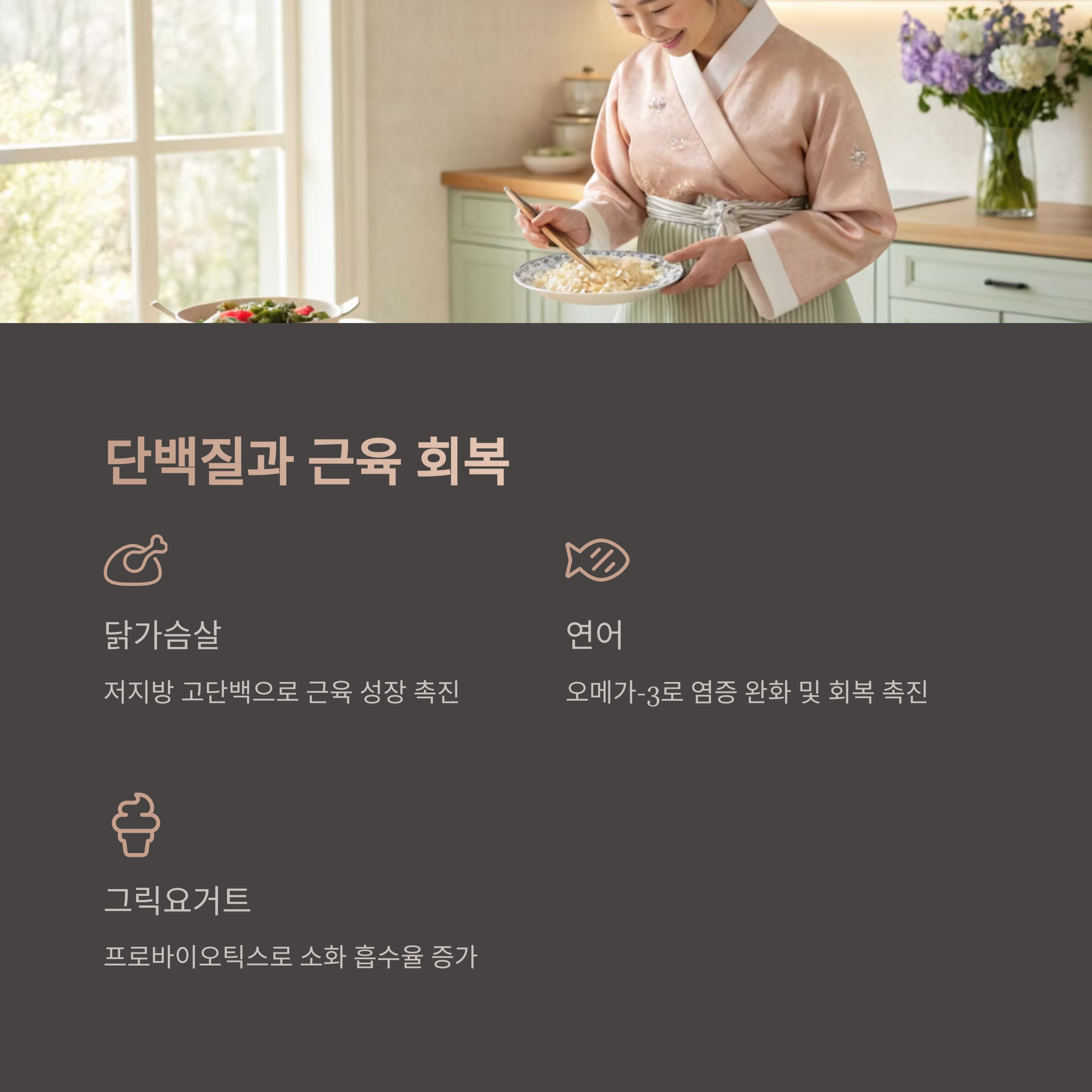 | 단백질 | 근육 유지 및 성장 | 닭가슴살, 두부, 그릭요거트 |